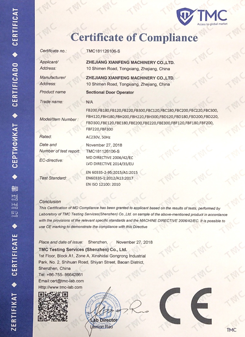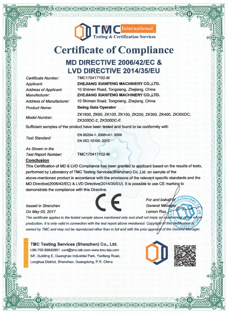Zhejiang Xianfeng Machinery Co., Ltd. is a large enterprise founded in 1970 and has successfully got the ISO9001:2000, CE, CQC and EMC testing certificates, as the first professional manufacture of automatic gate operators in China, the company is specializing in designing and manufacturing gate operators, which are widely used for sliding gates, swing gates, industrial doors, rolling doors, garage doors, automatic barriers and toll system, etc. our products not only sell well in domestic market but also are widely exported to Southeast Asia, Europe& America, Africa, the Middle East, Australia and other countries and regions.